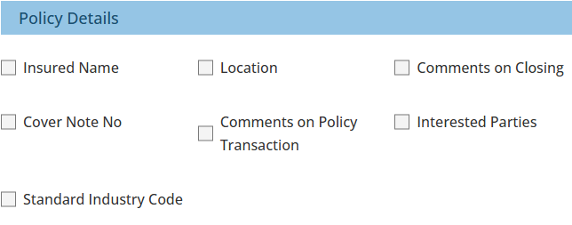 All fields on this page are applied to the fields found on the respective pages of a policy transaction. Selecting a field here makes it a mandatory field - meaning that when creating or editing a policy transaction, INSIGHT will stop you from progressing to the next page or saving your changes until you enter information in the field.
