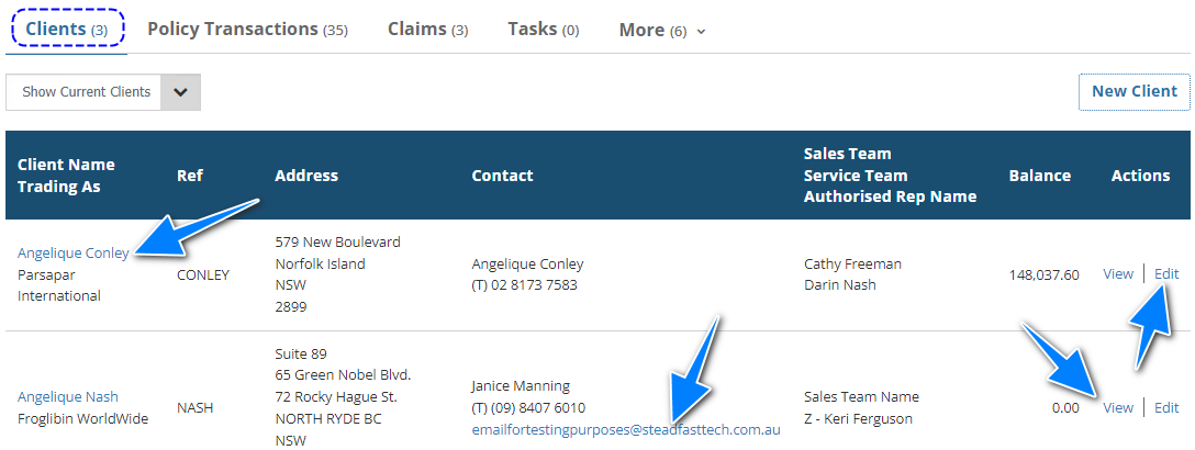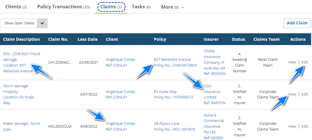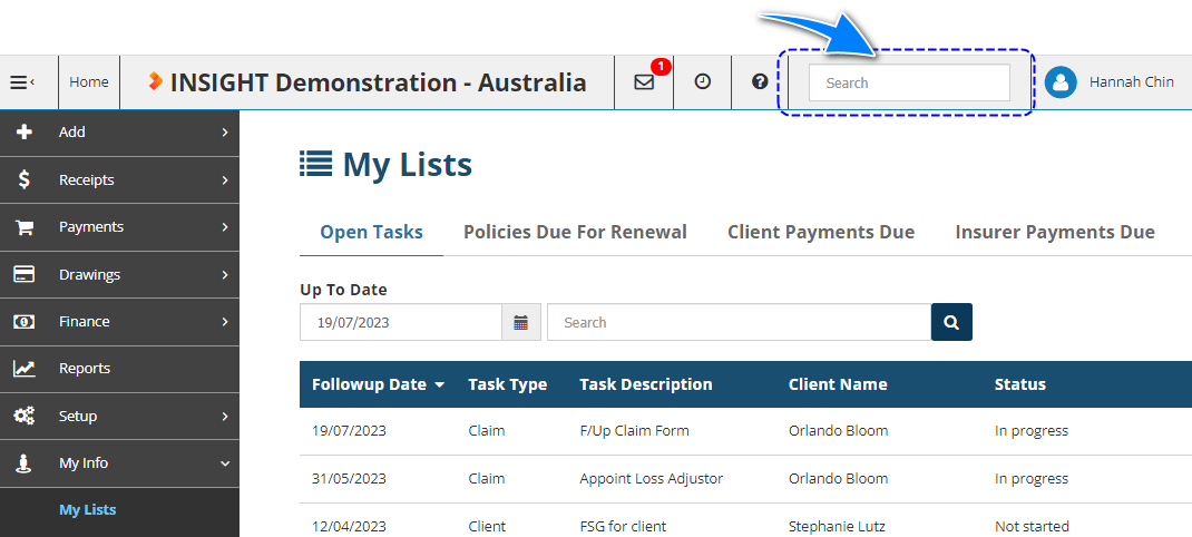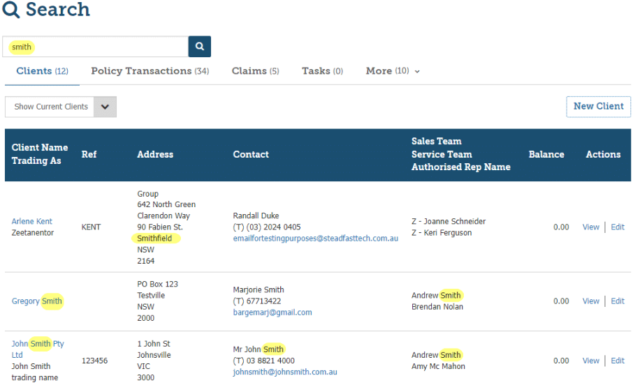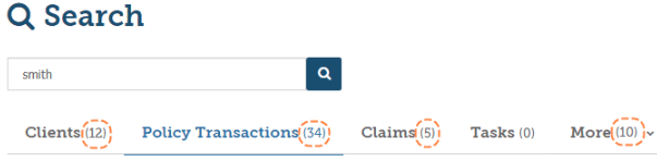 To organise the search results, they are grouped with different tabs such as Client, Policy Transactions, Claims, Tasks, Contacts, Insurers and Authorised Reps.
