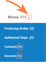 When you see a number in parenthesis beside the More tab, this indicates that there are more tabs that match your search criteria. Select the down arrow to view these additional tabs. For example, in the image, there are a total of 10 results in the More tab that are made up of 9 results in Contacts and 1 result in Insurers. | ![]() |