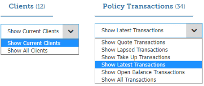 | In the event, your search criteria belong to an inactive client or transaction, use the dropdown menu to change to the relevant filter, ie: Show All Clients or Show All Transactions. By default, INSIGHT will display current clients and the latest transactions. | ![]() |