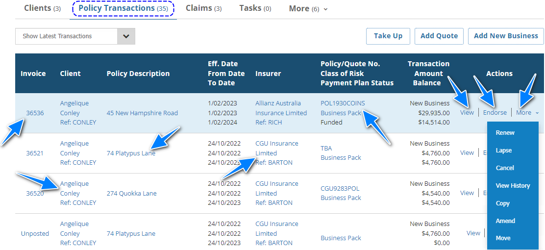 | More | Reveals more actions such as Renew, Lapse, Cancel, View History, Copy, Amend and Move. |