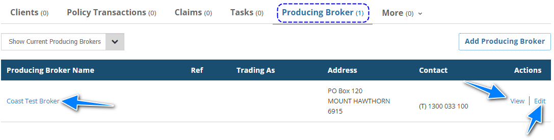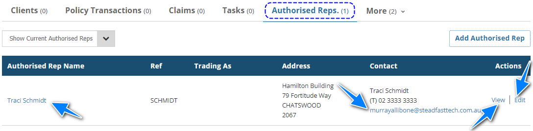 | View | Takes you to the authorised rep's or producing broker's profile. |