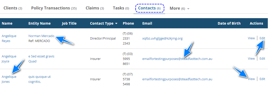 | Entity Name | Takes you to the client's profile that the contact belongs to. |