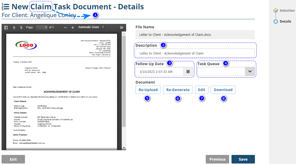 1. Wizard Name - The name of the wizard will differ depending on the type of task the document is being added to. For example, this could display "New Client Task Document", "New Policy Task Document" or "New Claim Task Document".