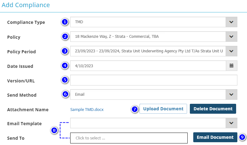| Compliance Record Type | Policy | Policy Period | Policy Transaction | Date Issued | Version | Send Method | Upload Document |