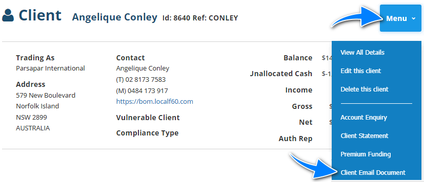 ![]() | Select an email address - this displays the client's and contact's email addresses. |