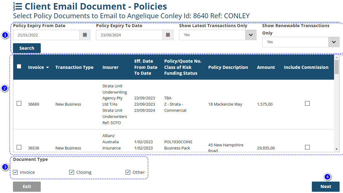 ![]() | Use the filters to obtain the transactions to wish to generate documents for. For example, if you wish to send quotations, change Show Latest Transaction Only and Show Renewable Transactions Only from Yes to No. Once you've chosen your filters, select Search to update the transaction list. |