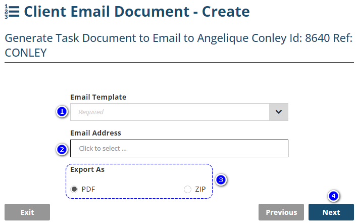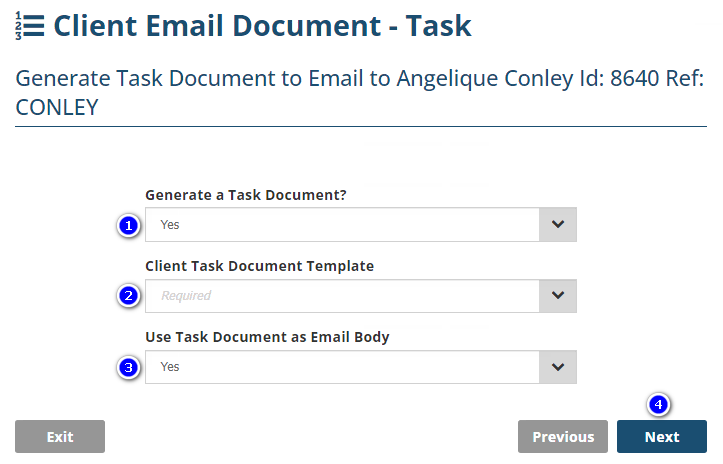 ![]() | Make your selection from the Client Task Document Template dropdown - this displays the templates available in Configuration. |