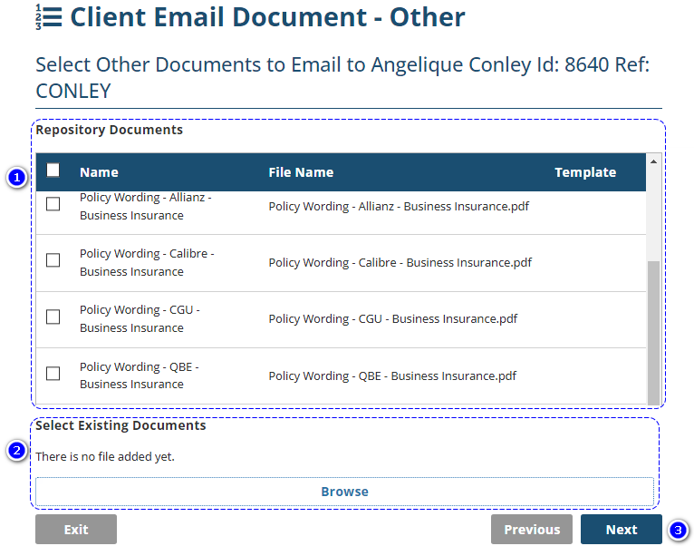 ![]() | This displays any documents that have been uploaded by your Administrator as Repository documents - you can select as many as you need. |