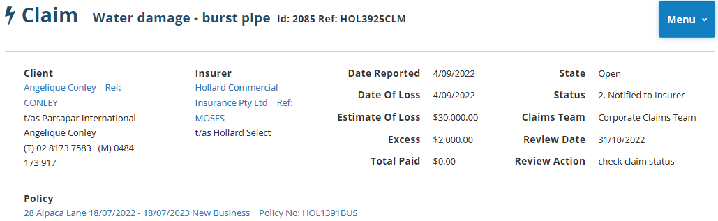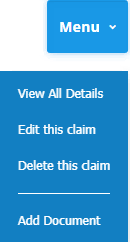 | To access all claim information, go to the Menu and select View All Details. You'll also find the options to Edit this claim and Delete this Claim in the Menu. However, once a claim has tasks/documents added to it, INSIGHT will NOT allow you to delete the claim. | ![]() |