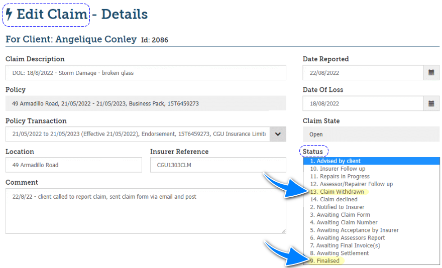 ![]() | Change the Status to Finalised or Claim Withdrawn. |