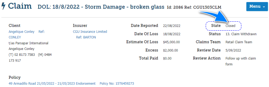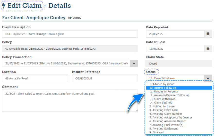 When it comes time to close the claim (for example, once the claim has been paid out by the Insurer) you can update the claim's status to reflect this.