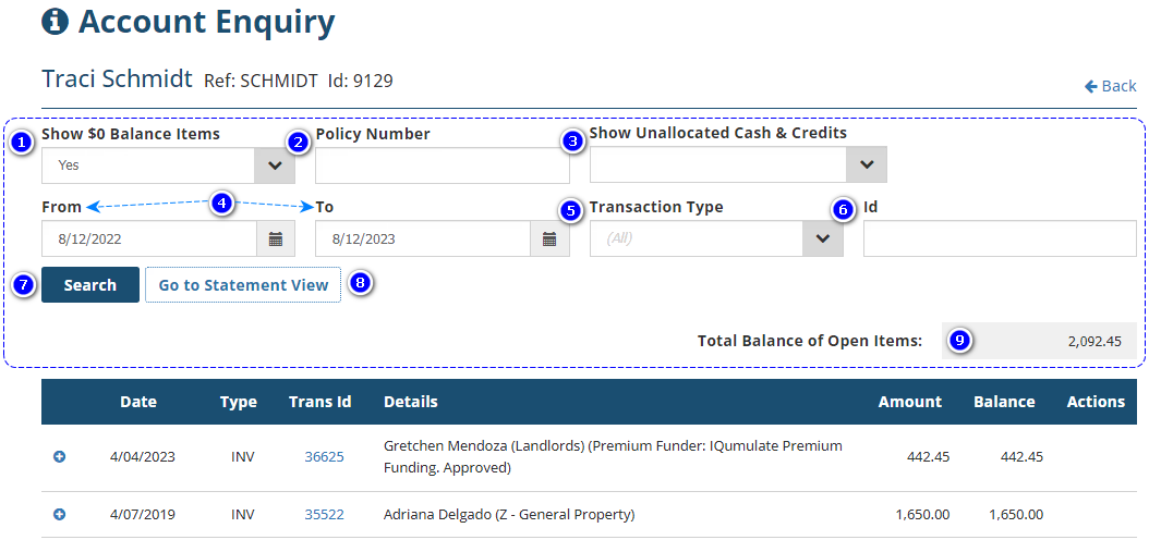8. Go to Statement View - Allows you to view the account enquiry in Statement View.