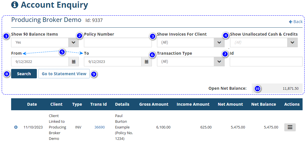 9. Go to Statement View - Allows you to view the account enquiry in Statement View.