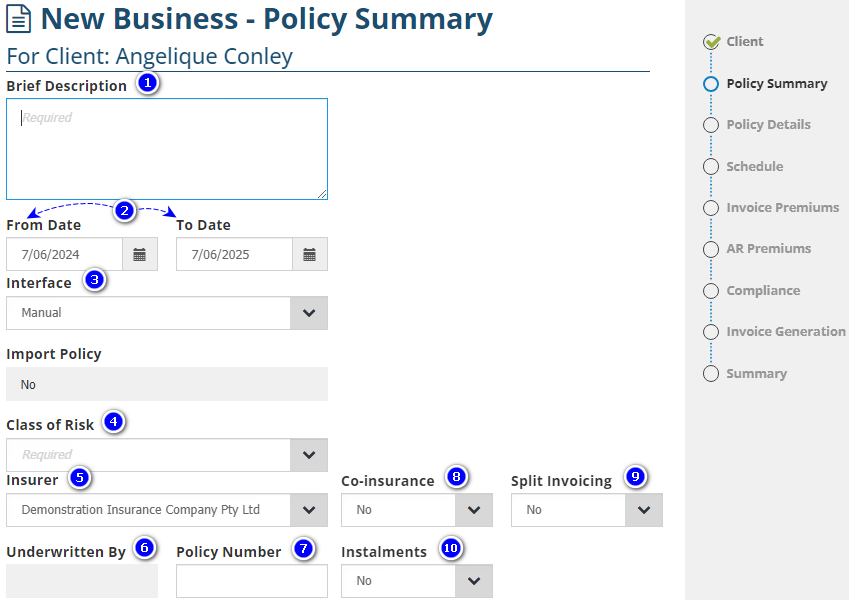 1. Brief Description - This is a mandatory field; also known as the Policy Description in other parts of INSIGHT. Information entered here can be used to search for the policy. To make searching easier, you may enter risk-specific data such as the vehicle registration number or the situation address.