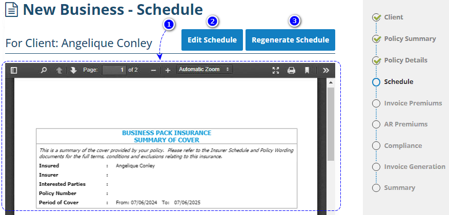 ![]() | Custom Risk Forms - Uses a 'Custom Risk form' before the Schedule page where you can enter risk information. When you go to the Schedule page, the risk information auto-inserts into a pre-formatted schedule. Basic formatting can be done on the Schedule page, however, changes to the risk information must be done on the Custom Risk Form page. From there, return to the Schedule page & use the Regenerate Template button to update the schedule. |