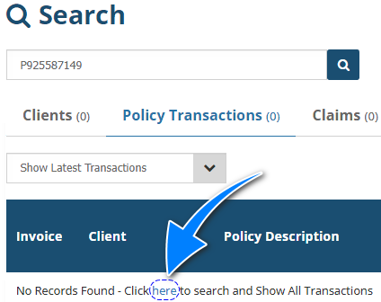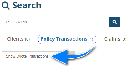 IMPORTANT: INSIGHT does not generate a closing or a "quote slip" for the insurer.When using the search bar to locate a quote, you may receive the result "No records found" as INSIGHT defaults to displaying invoiced transactions. In this scenario, ensure that you select here. This changes the filter to ''Show All Transactions" & updates the list to include quotations. | ![]() |