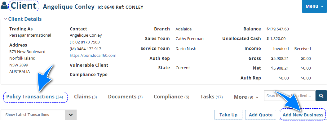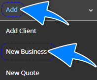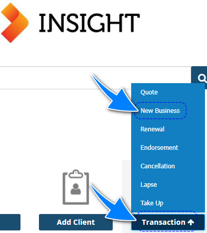 Client profileWhen viewing the Client profile, ensure you're in the Policy Transactions tab and select Add New Business.