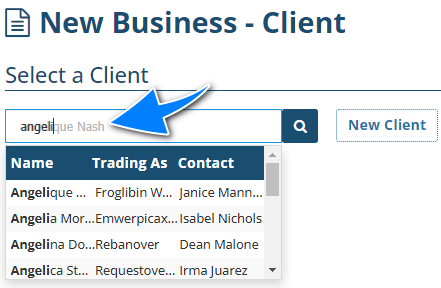 NOTE: When initiating via options 1 or 2, you will be prompted to enter a client name or to add the new client, if currently not in INSIGHT.  If the client name is in the system, you can start typing the client's name and INSIGHT will return all matching results, as shown below: