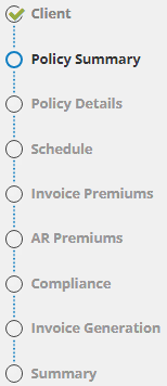 NOTE: When a feature is activated in the Policy Summary page, the New Business wizard will automatically include the specific page for that feature, for example: Split Invoicing, Co-insurance, Instalments, SCTP, Sunrise.