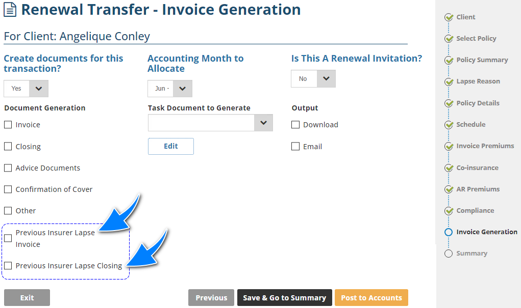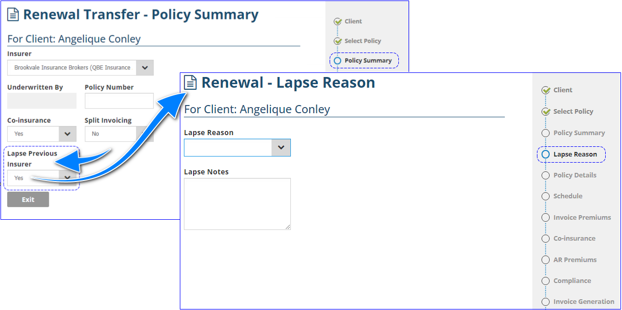 - Yes - Adds a Lapse Reason page to the wizard and lapses the previous policy. Also, adds an option to send lapse documentation to the previous insurer found on the Invoice Generation page.