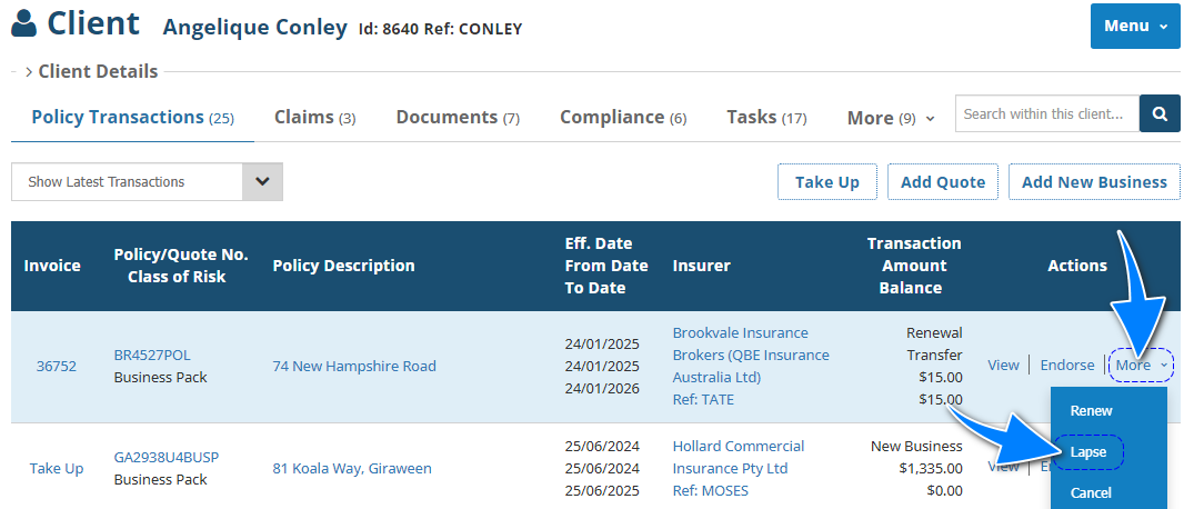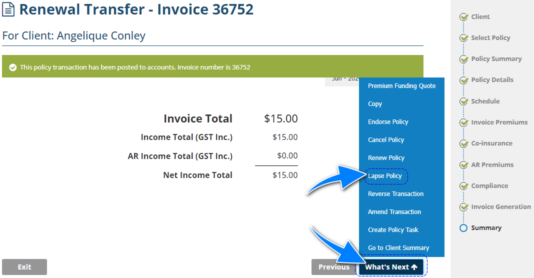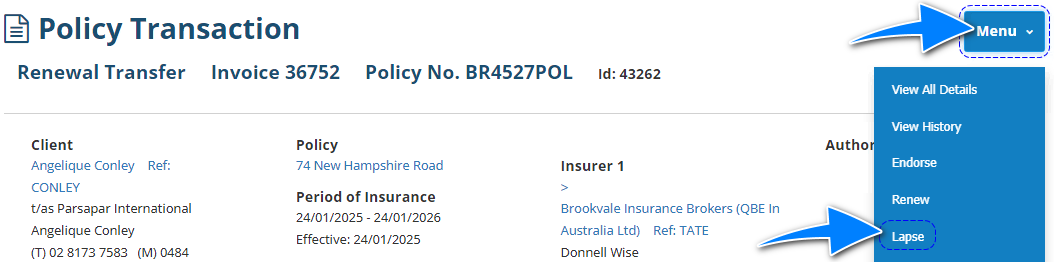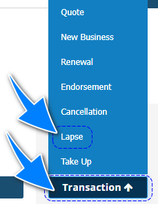 NOTE: When initiating via option 1, you will be prompted to enter an existing client name. From there, a list of the client's transactions that can be lapsed will be displayed. Using the list, choose the transaction you wish to lapse.