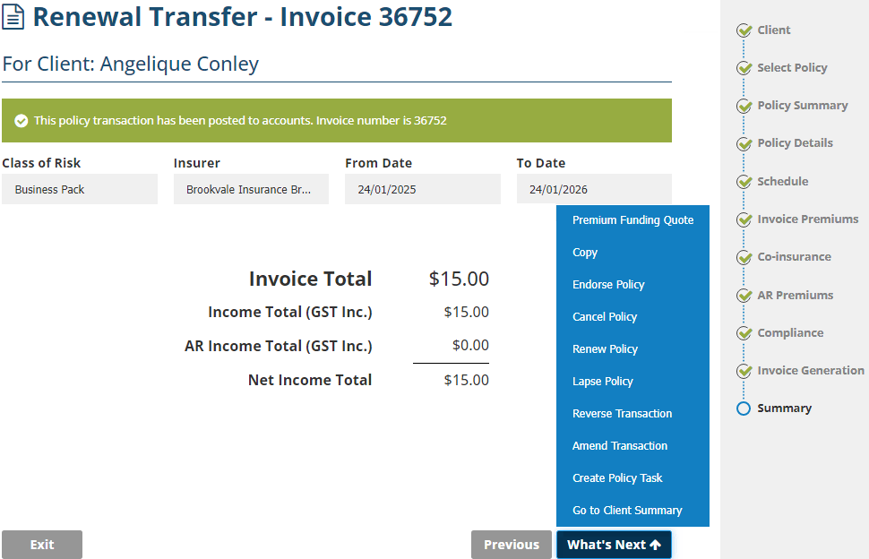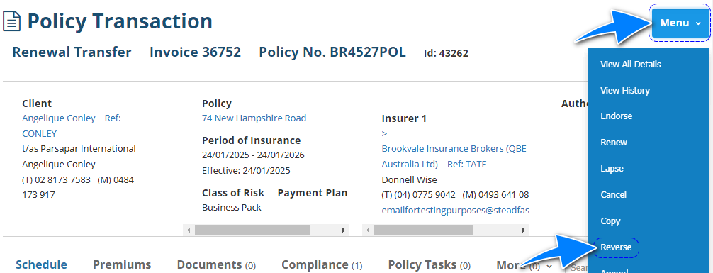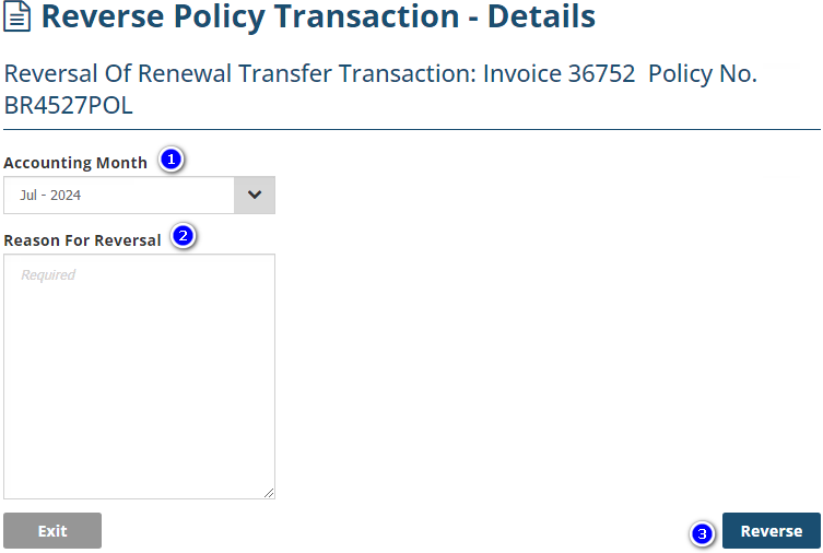 The purpose of reversing is typically when a transaction was posted to accounts with the wrong information. For example, the wrong insurer, premiums, client, or perhaps a renewal was issued instead of a renewal invitation. Completing a reverse will revert the transaction to its prior state (ie: ready for renewal), reverse its premiums and provide an audit trail in the policy's history.