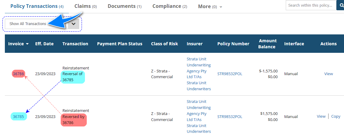 When viewing a client's or policy's list of transactions, use the "Show All Transactions" filter to see the reversal's audit trail.