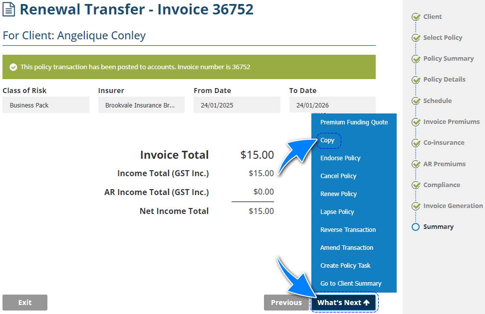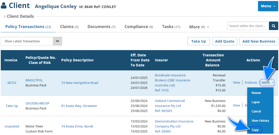 ![]() | Client or Policy level | Locate the transaction & from its Actions, choose Copy. | ![]() |