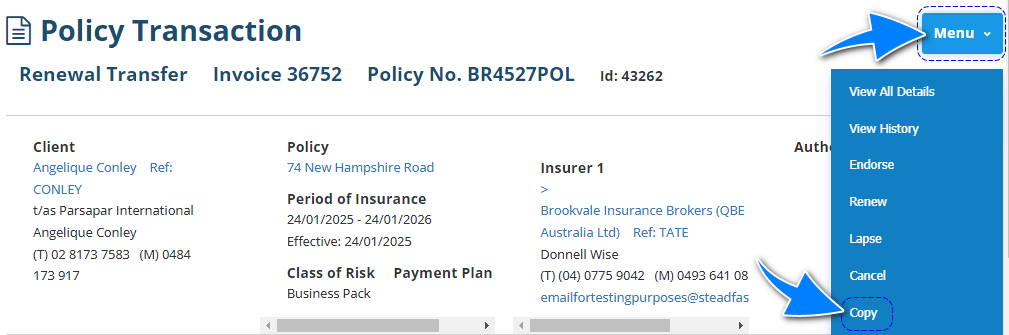 ![]() | Policy Transaction level | Select Menu, then Copy. | ![]() |