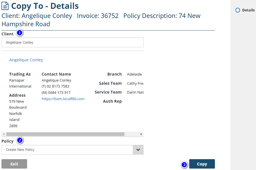 2. Policy - The options displayed here are determined by the type of transaction you're copying from. Refer to the table in the Introduction.