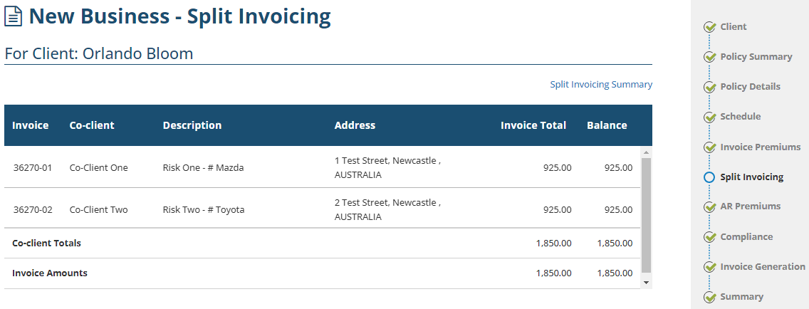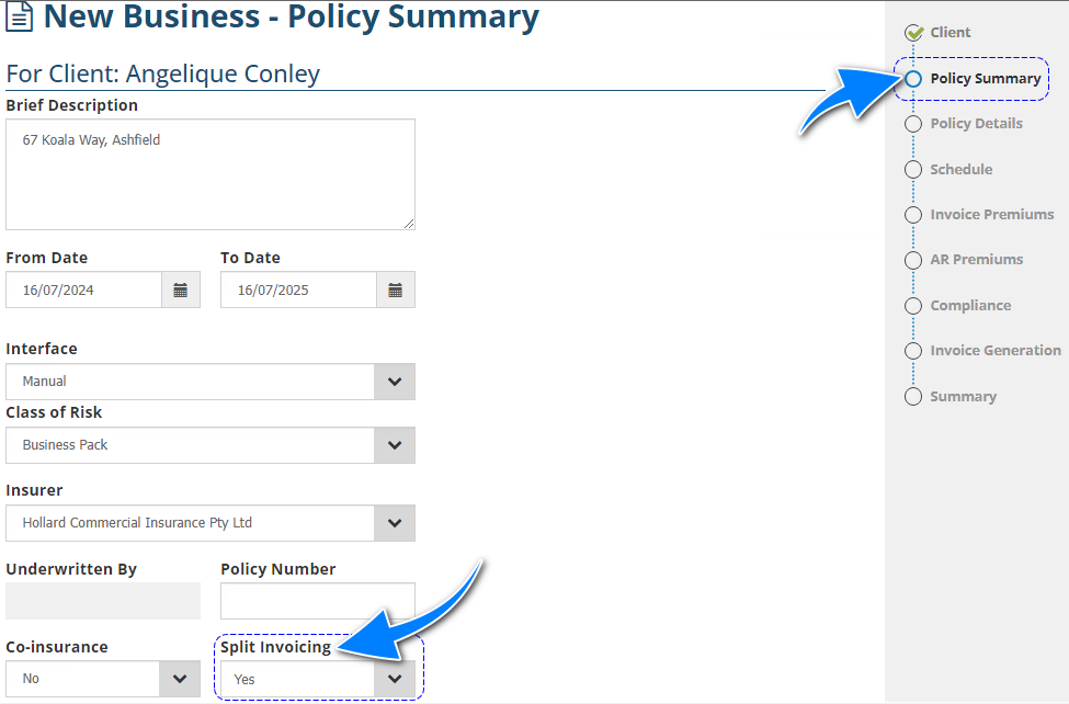 Enter information as per normal in the Policy Summary page of the wizard. At the bottom of the page, locate the Split Invoicing field and select Yes - this will add the Split Invoicing page and its features.
