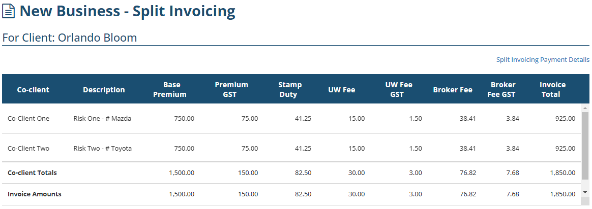 The Split Invoicing function enables you to split an invoice across multiple clients. Once activated within INSIGHT, multiple clients can be invoiced individually for payment for a single policy.