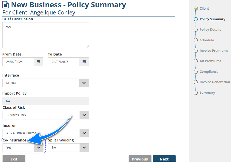 The Co-insurance function ONLY applies to Manual policies. You can initiate a new Co-insurance policy by initiating a New Business transaction or a Renewal transaction. Enter information as per normal in the Policy Summary step of the wizard. At the bottom of the page, locate the Co-insurance field and select Yes - this will update the wizard with the Co-insurance step and features.