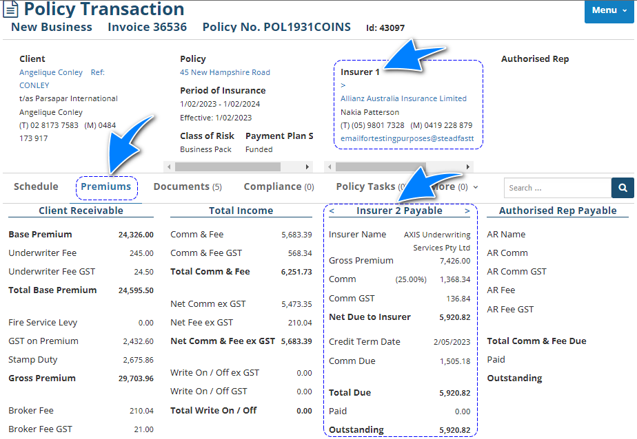 You'll notice there is a number after the word Insurer. This indicates that there is more than one Insurer on this policy; Insurer 1 is the Lead Insurer. You'll also notice a > or < symbol in both Insurer areas. These symbols allow you to change through the different Co-insurers attached to the policy. On the header, you can use the Insurer hyperlink to go to the respective Insurer profile. In the Premiums section, you can view each Co-insurer's premium breakdown.