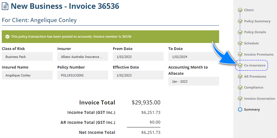 Once inside the wizard, you'll notice the Co-insurance page - this indicates the policy has Co-insurance.