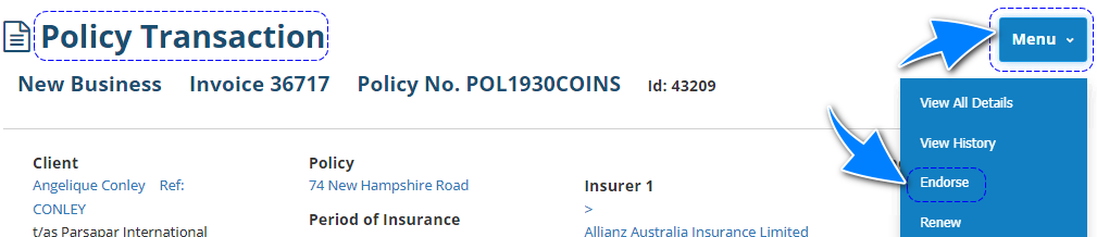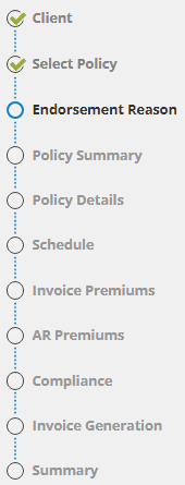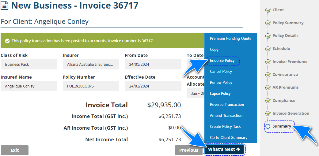 Transaction wizardWhen applicable, the wizard includes the Endorse Policy option in the What's Next button of the Summary page