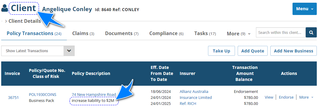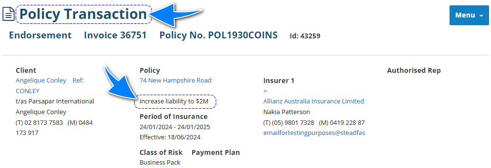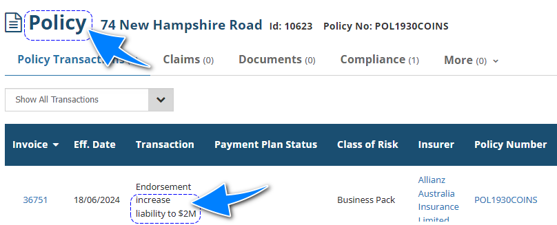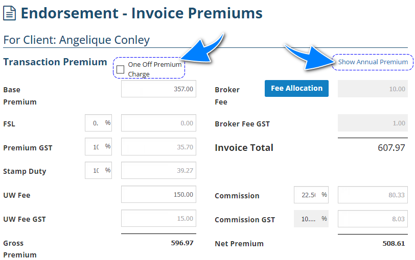• Invoice Premiums page - Once Off Premium Charge and Show Annual Premium