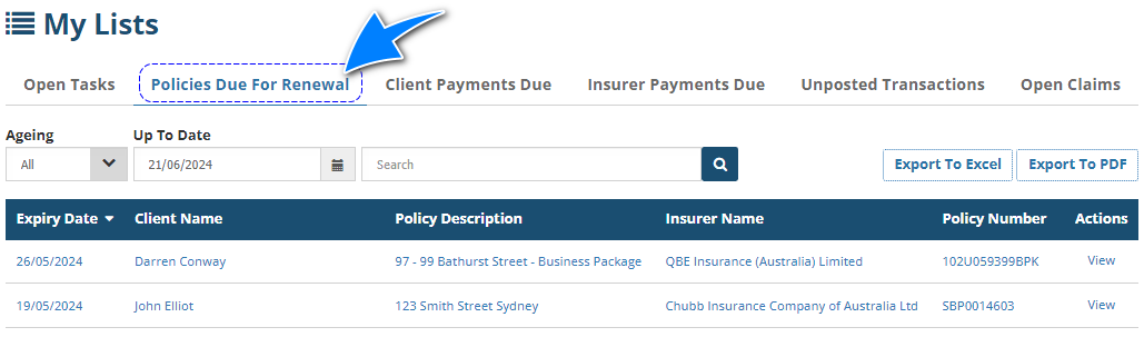 Out of the 6 available lists, select the tab for Policies Due for Renewals. You can adjust your list using the Ageing and Up To Date filters. From here, you can work through the list by opening each renewal in a different tab and returning to your list for the next renewal. Alternatively, once you have adjusted your list, you can export the list as an Excel or PDF file and continue to work through your renewals in that manner.