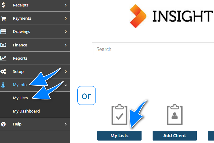 You will find a shortcut to My Lists on the home page. If not on the home page, select the My Info option from the side menu, then choose My Lists.