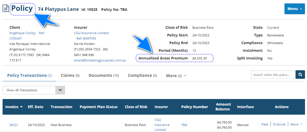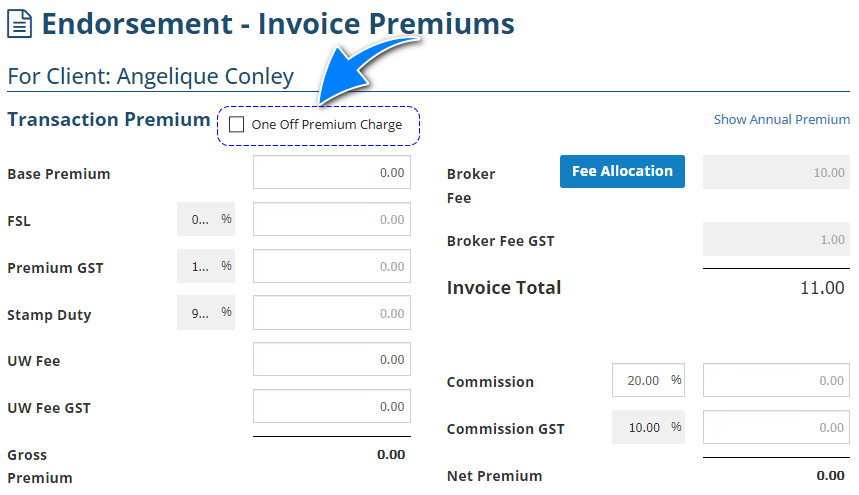 ![]() | For Endorsement transactions only, there is a One Off Premium Charge checkbox displayed. When the checkbox is ticked, the relationship (and auto-calculation) between the Transaction Premium and Annual Premium will be removed. For example, in an Endorsement, the broker can enter a $500 Transaction Premium but update the Annual Premium to $2000. Subsequent Endorsements and Renewals would be based on the new Annual Premium and not the last Transaction Premium. |