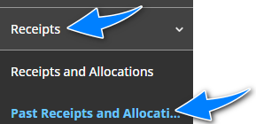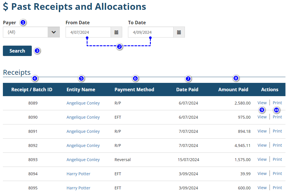 The page is divided into the top filter area and the bottom receipts display area. The filters have default values, however, you can modify these to locate the receipt you wish to review. The receipts displayed can be sorted using the headers in the blue bar.