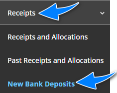 | The New Bank Deposits wizard is generally used to create deposit slips for banking cash and cheques or record-keeping purposes for other receipt types. All receipts created in INSIGHT are available in this wizard. The wizard is found by selecting Receipts, then New Bank Deposits. ![]() | The pages to be completed are:![]() |