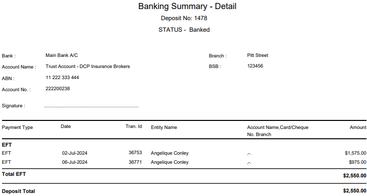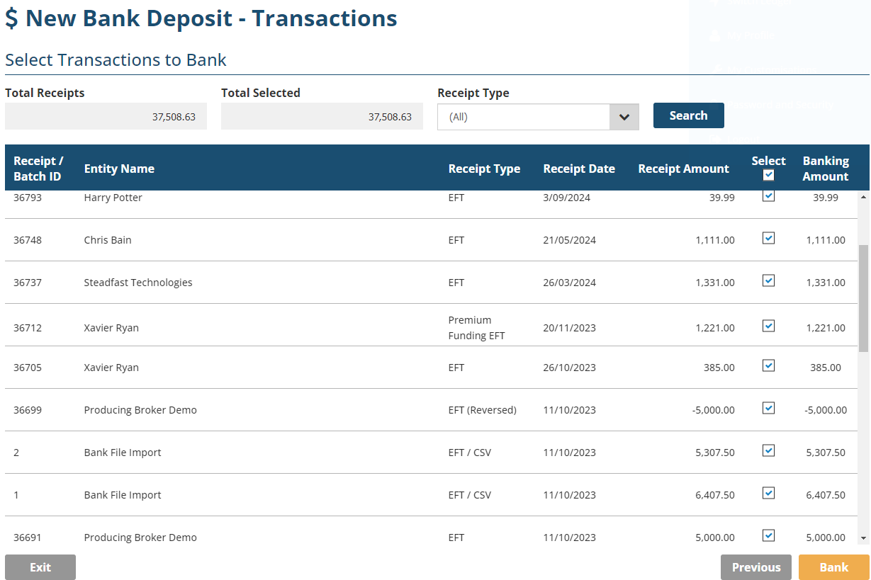![]() | Use the Receipt Type filter, then select Search to update the list with specific receipts based on receipt type. For example, you can create a separate bank deposit slip for EFT and Premium Funding EFT. |
