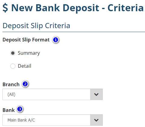| This page allows you to choose what and how information is presented in the bank deposit slip. |