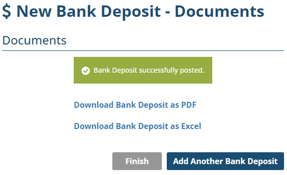 | This page confirms the end of the wizard and provides the opportunity to download the bank deposit slip as a PDF or Excel. Once out of the wizard, you can re-download the document through Past Bank Deposits. | ![]() |