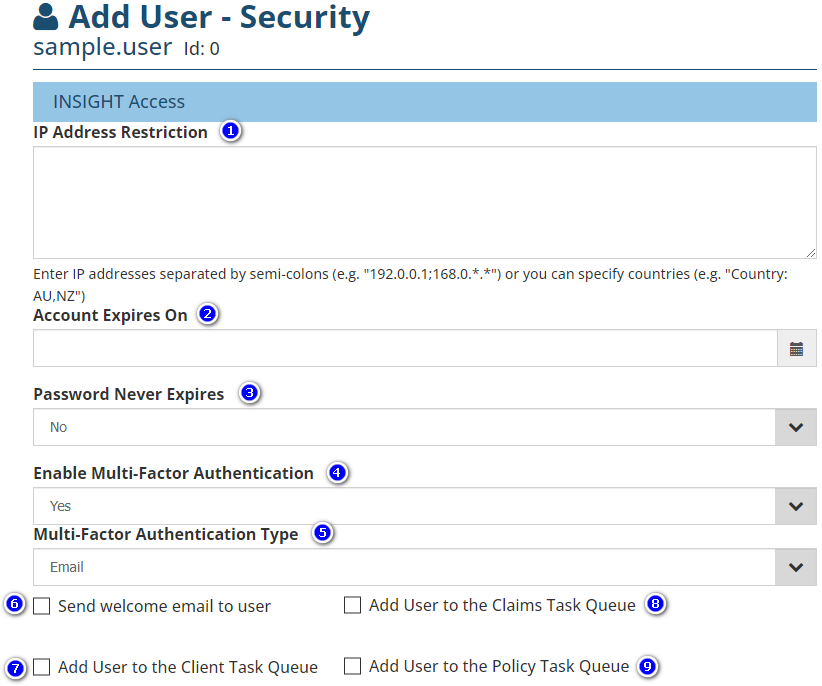 1. IP Address Restriction - generally used for remote INSIGHT users; the user can only access INSIGHT by using the IP Addresses or Countries entered here.