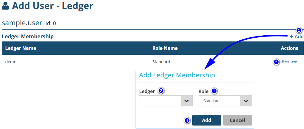 1. Add - if your business manages multiple ledgers, select this to add the user to the relevant ledgers. Alternately, use this to update a user's role.
