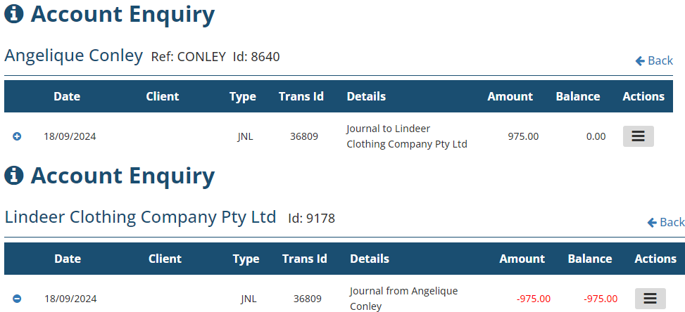 A sample below shows a journal of $975 from Angelique Conley to Lindeer Clothing Company Pty Ltd. The receipt/credit is now available in the recipient's account to be used to pay their invoice, journal to another client or refund to the client.