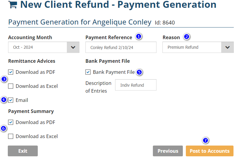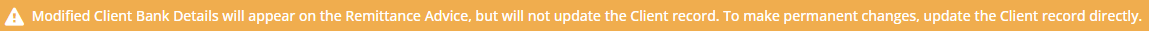 ![]() | You can edit the bank details on this page if the client requests to pay the refund to a different account. INSIGHT will display a message, advising that these details are only used for this remittance and that the client record needs to be updated if these details are to be used for the client permanently. |
